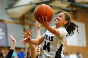 Kamiak’s Bella Hasad hits an acrobatic layup in the final moments of a game against Glacier Peak on Wednesday, Feb 1, 2023, at Kamiak High School in Mukilteo, Washington. (Ryan Berry / The Herald)