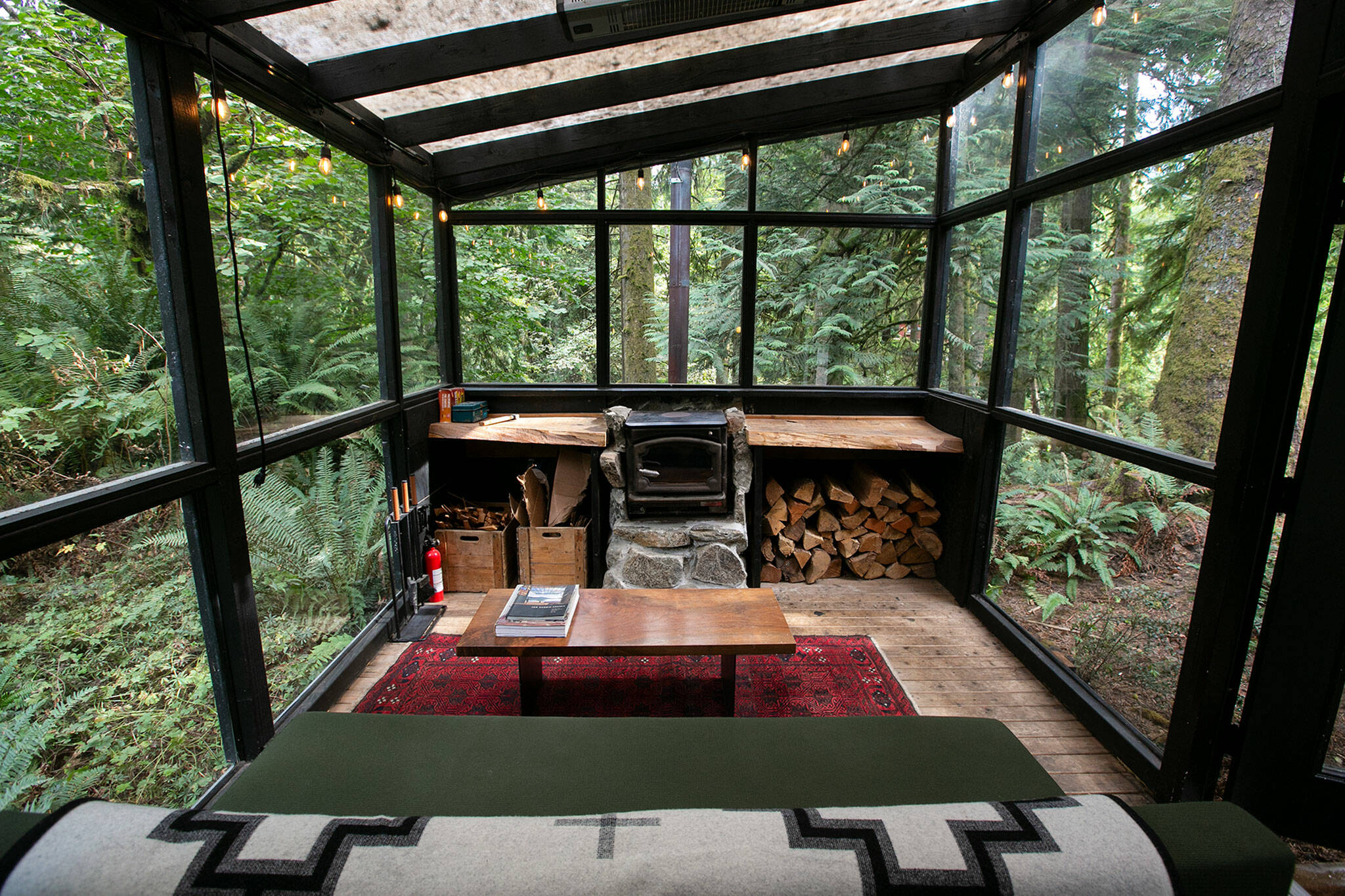 The owners also built the bunkhouse next door with room to sleep two more. The 120-square-foot addition features floor-to-ceiling windows that look out at the creek.